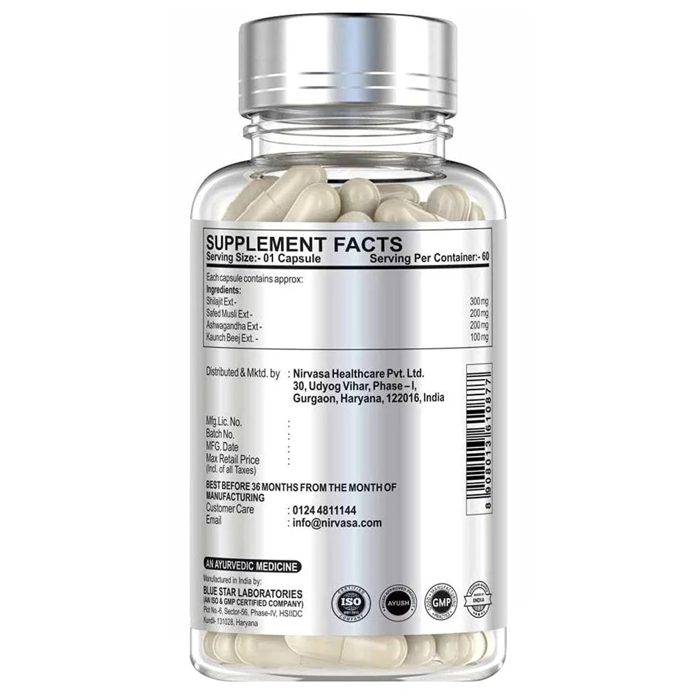 - Quantity: 60 vegetarian capsules with pure Shilajit, Ashwagandha, and Kaunch Beej sourced from natural sources