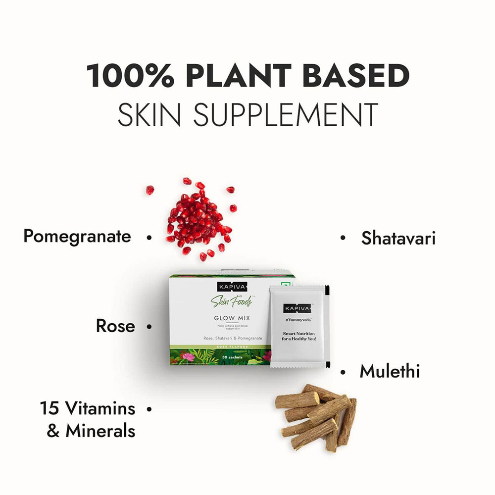 MODERN AYURVEDIC NUTRITION FOR SKINCARE - Tired of skin care products that cause damage to your skin? Switch to Kapiva Skin Foods Glow Mix - a modern ayurvedic skin glow supplement made of ayurvedic herbs like Amla & Aloe Vera along with ingredients like pomegranate, rose, mulethi to give your skin a healthy glow.